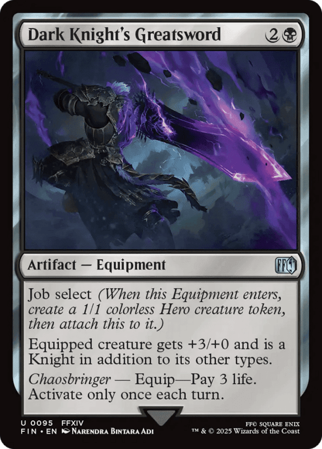 Job select (When this Equipment enters, create a 1/1 colorless Hero creature token, then attach this to it.) Equipped creature gets +3/+0 and is a Knight in addition to its other types. Chaosbringer — Equip—Pay 3 life. Activate only once each turn.