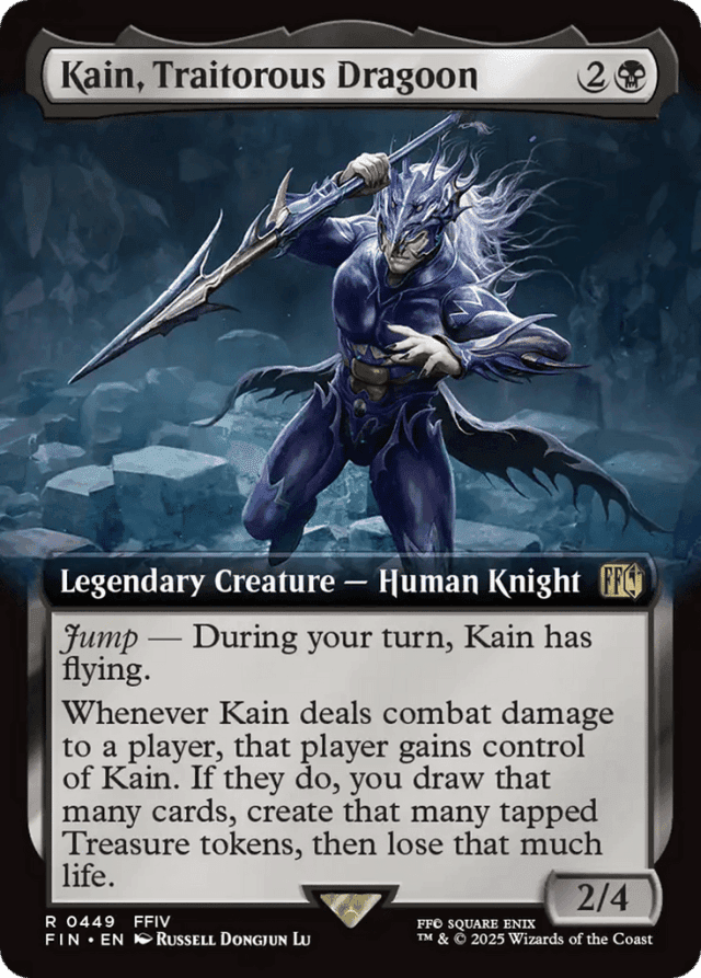 Jump — During your turn, Kain has flying. Whenever Kain deals combat damage to a player, that player gains control of Kain. If they do, you draw that many cards, create that many tapped Treasure tokens, then lose that much life.
