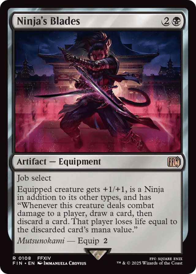 Job select Equipped creature gets +1/+1, is a Ninja in addition to its other types, and has "Whenever this creature deals combat damage to a player, draw a card, then discard a card. That player loses life equal to the discarded card's mana value." Mutsunokami — Equip {2}