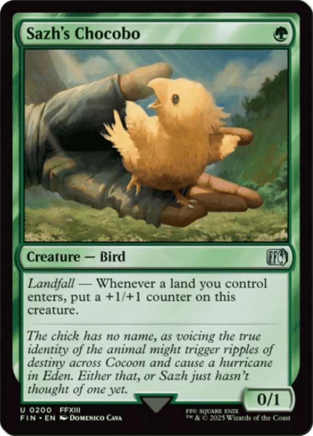 The chick has no name, as voicing the true identity of the animal might trigger ripples of destiny across Cocoon and cause a hurricane in Eden. Either that, or Sazh just hasn't thought of one yet.