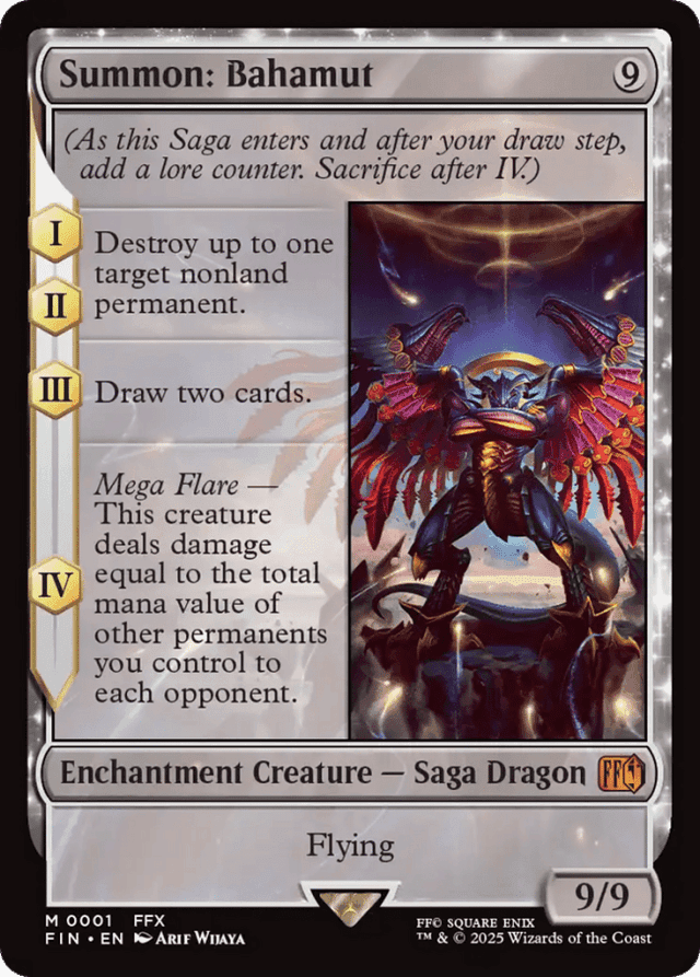 (As this Saga enters and after your draw step, add a lore counter. Sacrifice after IV.) I, II — Destroy up to one target nonland permanent. III — Draw two cards. IV — Mega Flare — This creature deals damage equal to the total mana value of other permanents you control to each opponent. Flying