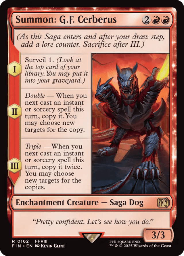 (As this Saga enters and after your draw step, add a lore counter. Sacrifice after III.) I — Surveil 1. (Look at the top card of your library. You may put it into your graveyard.) II — Double — When you next cast an instant or sorcery spell this turn, copy it. You may choose new targets for the copy. III — Triple — When you next cast an instant or sorcery spell this turn, copy it twice. You may choose new targets for the copies.
