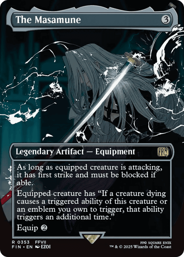 As long as equipped creature is attacking, it has first strike and must be blocked if able. Equipped creature has "If a creature dying causes a triggered ability of this creature or an emblem you own to trigger, that ability triggers an additional time." Equip {2}