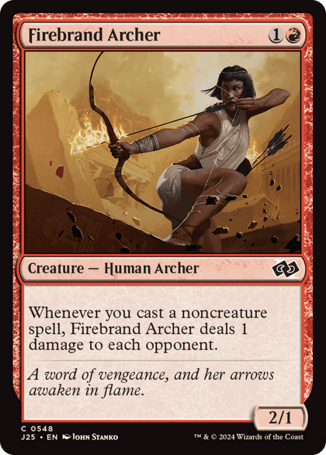 Firebrand Archer’s ability will resolve before the spell that caused it to trigger. The ability will resolve even if that spell is countered. — In a Two-Headed Giant game, Firebrand Archer’s ability causes it to deal a total of 2 damage to the opposing team.