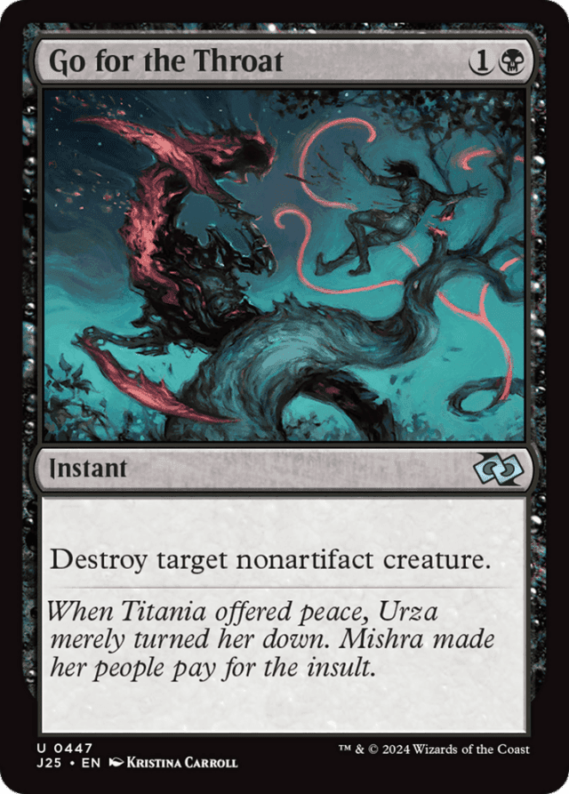 If the targeted creature is also an artifact when Go for the Throat tries to resolve, it won't resolve. — If the targeted creature is also an artifact when Go for the Throat tries to resolve, it won't resolve.