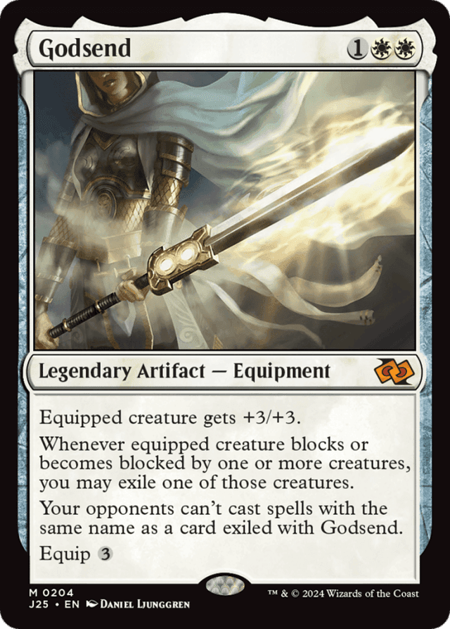 Equipped creature gets +3/+3. Whenever equipped creature blocks or becomes blocked by one or more creatures, you may exile one of those creatures. Your opponents can't cast spells with the same name as a card exiled with Godsend. Equip {3}