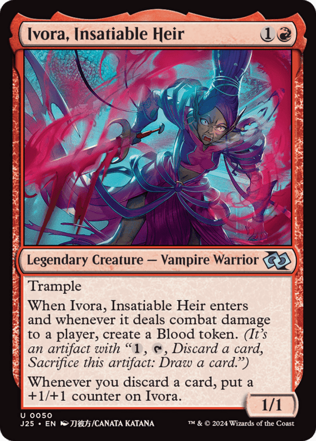 Trample When Ivora enters and whenever it deals combat damage to a player, create a Blood token. (It's an artifact with "{1}, {T}, Discard a card, Sacrifice this token: Draw a card.") Whenever you discard a card, put a +1/+1 counter on Ivora.