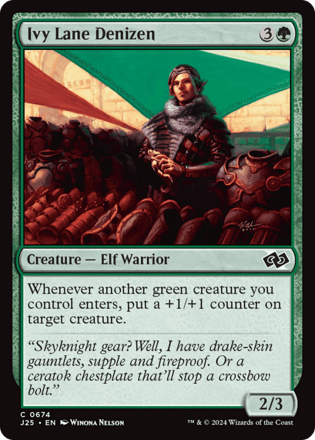 Ivy Lane Denizen can be chosen as the target of its own ability. — The green creature that entered the battlefield can be chosen as the target of Ivy Lane Denizen's ability.