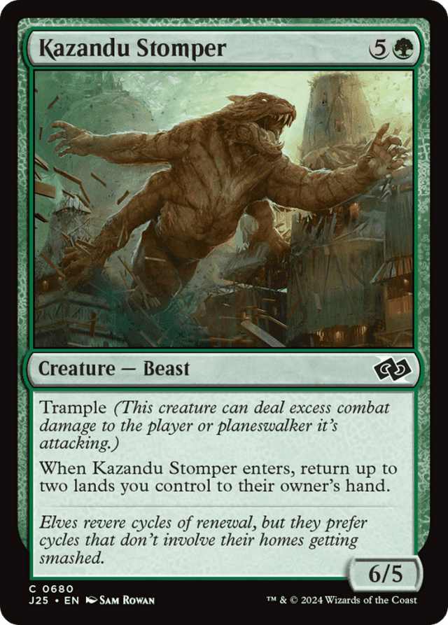 Trample (This creature can deal excess combat damage to the player or planeswalker it's attacking.) When this creature enters, return up to two lands you control to their owner's hand.