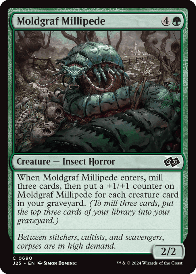 Moldgraf Millipede gets a +1/+1 counter for every creature card in your graveyard, including any creature cards that were already there before you milled three cards.