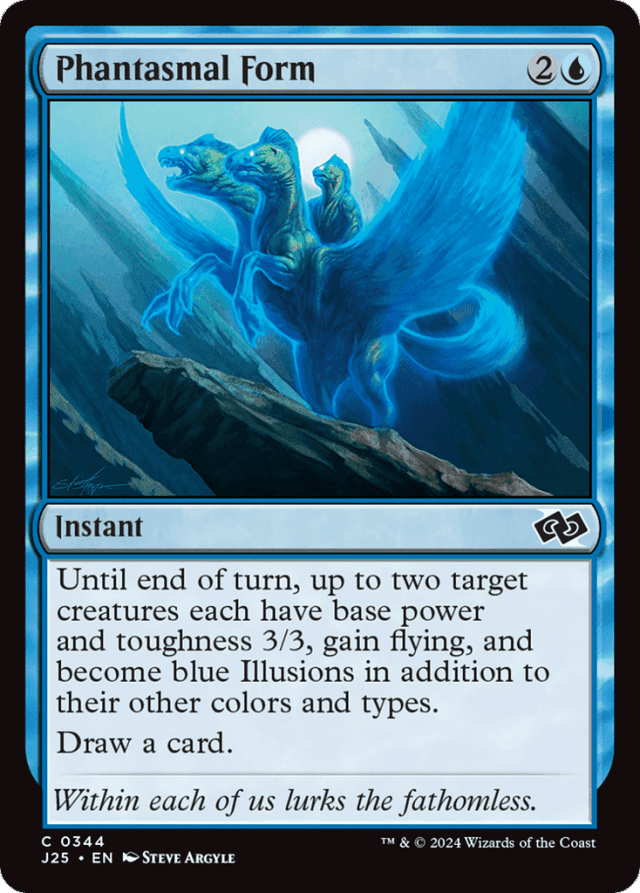 Until end of turn, up to two target creatures each have base power and toughness 3/3, gain flying, and become blue Illusions in addition to their other colors and types. Draw a card.