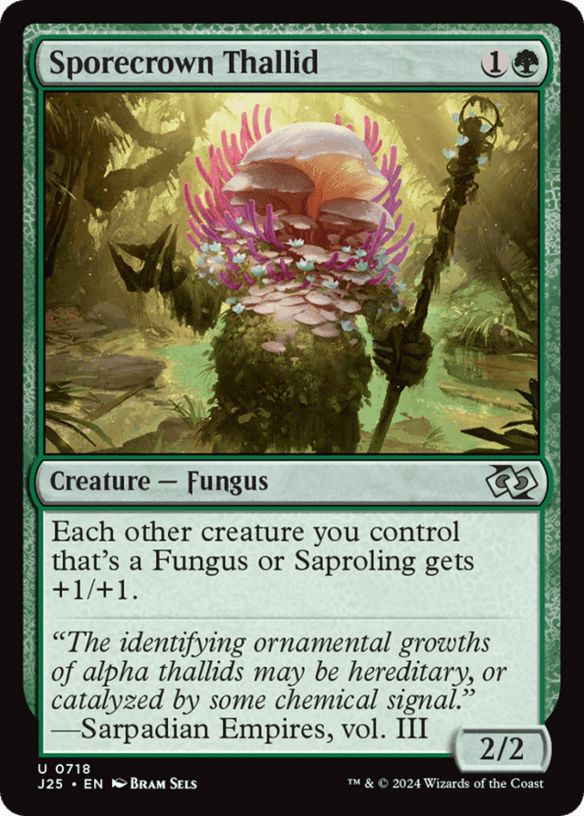 Because damage remains marked on a creature until it's removed as the turn ends, nonlethal damage dealt to a Fungus or Saproling creature you control may become lethal if Sporecrown Thallid leaves the battlefield during that turn. — If a creature is somehow both a Fungus and a Saproling, Sporecrown Thallid's ability gives it only +1/+1.