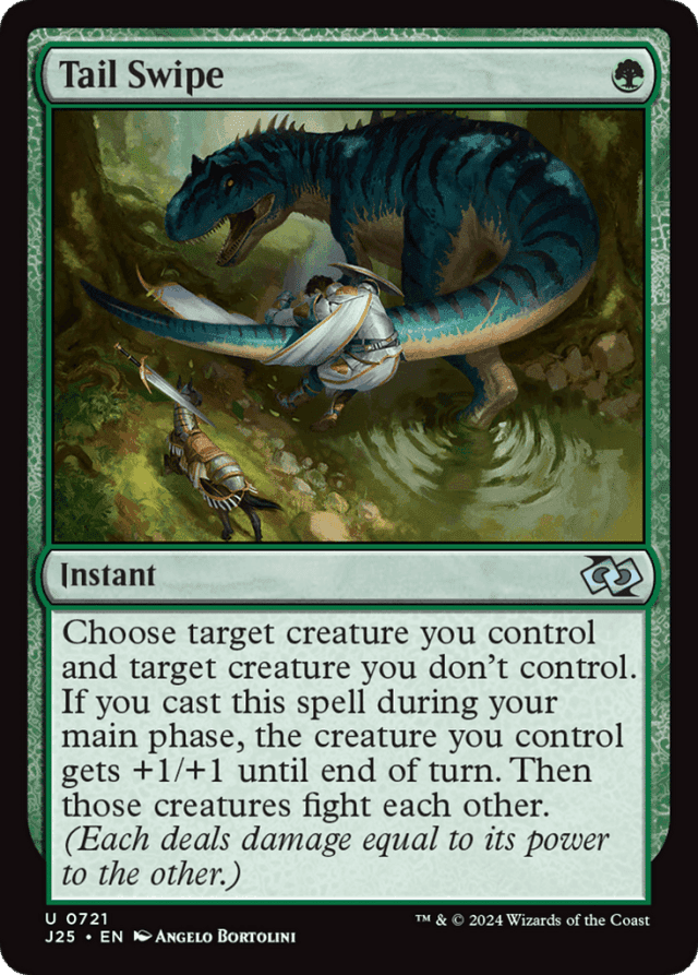 Choose target creature you control and target creature you don't control. If you cast this spell during your main phase, the creature you control gets +1/+1 until end of turn. Then those creatures fight each other. (Each deals damage equal to its power to the other.)
