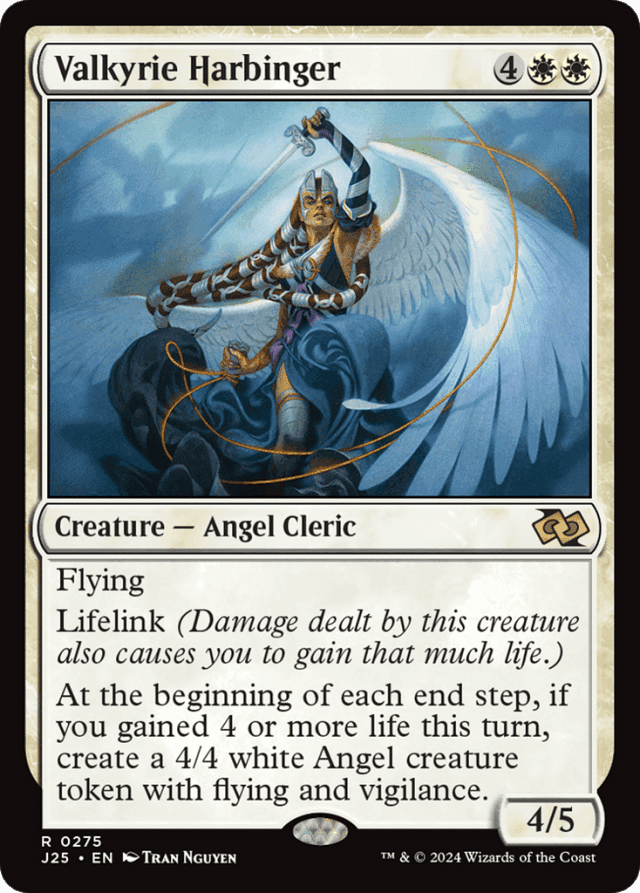 Flying Lifelink (Damage dealt by this creature also causes you to gain that much life.) At the beginning of each end step, if you gained 4 or more life this turn, create a 4/4 white Angel creature token with flying and vigilance.