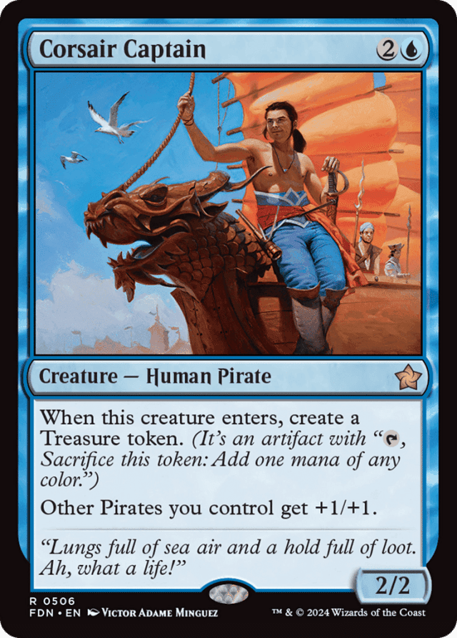 When this creature enters, create a Treasure token. (It's an artifact with "{T}, Sacrifice this token: Add one mana of any color.") Other Pirates you control get +1/+1.