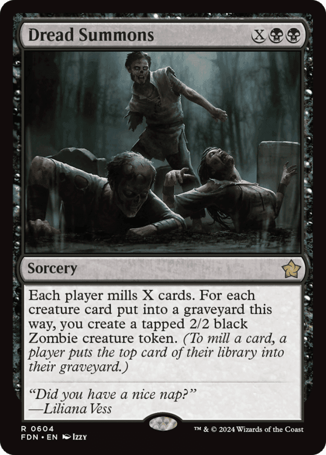 Each player mills X cards. For each creature card put into a graveyard this way, you create a tapped 2/2 black Zombie creature token. (To mill a card, a player puts the top card of their library into their graveyard.)