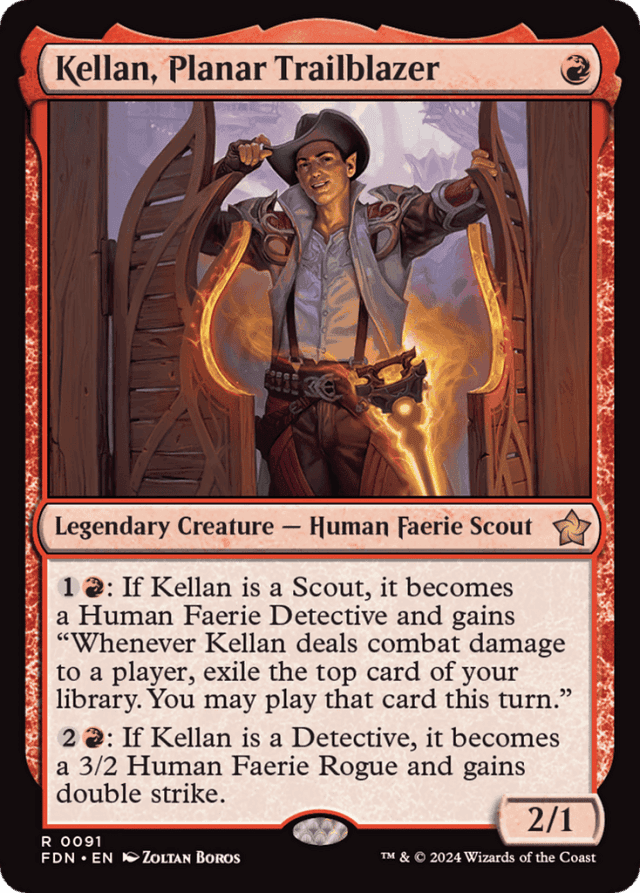 {1}{R}: If Kellan is a Scout, it becomes a Human Faerie Detective and gains "Whenever Kellan deals combat damage to a player, exile the top card of your library. You may play that card this turn." {2}{R}: If Kellan is a Detective, it becomes a 3/2 Human Faerie Rogue and gains double strike.