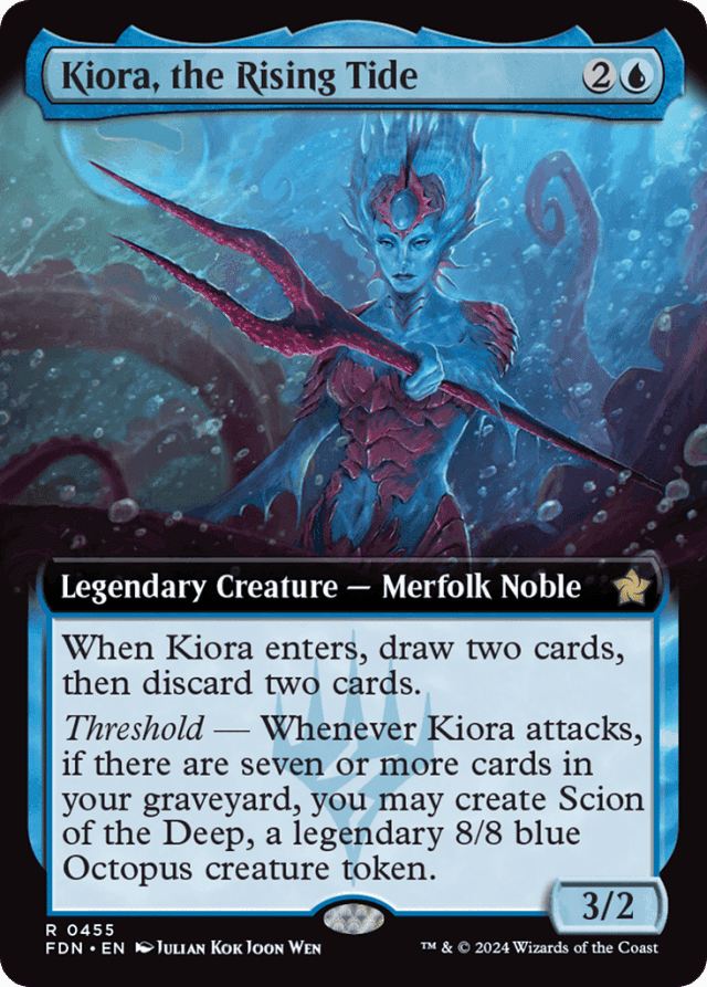 When Kiora enters, draw two cards, then discard two cards. Threshold — Whenever Kiora attacks, if there are seven or more cards in your graveyard, you may create Scion of the Deep, a legendary 8/8 blue Octopus creature token.