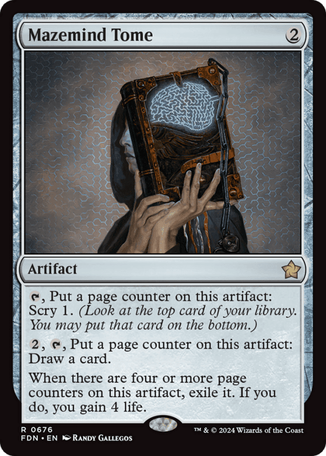 {T}, Put a page counter on this artifact: Scry 1. (Look at the top card of your library. You may put that card on the bottom.) {2}, {T}, Put a page counter on this artifact: Draw a card. When there are four or more page counters on this artifact, exile it. If you do, you gain 4 life.