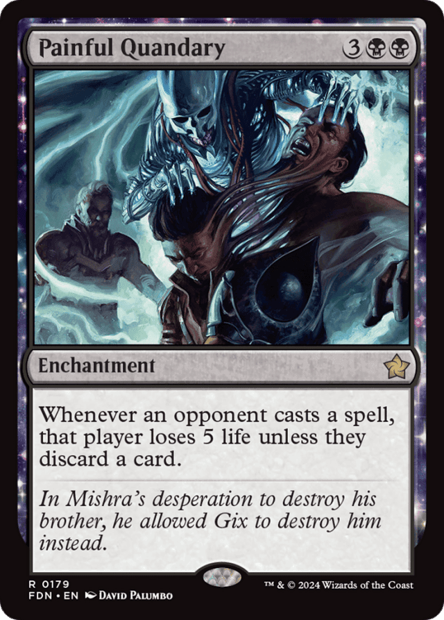 Whenever an opponent casts a spell, that player loses 5 life unless they discard a card.
