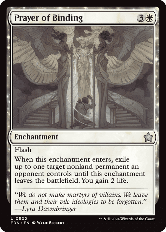 Auras attached to the exiled permanent will be put into their owners' graveyards. Any Equipment will become unattached and remain on the battlefield. Any counters on the exiled permanent will cease to exist. When the card returns to the battlefield, it will be a new object with no connection to the card that was exiled. — If Prayer of Binding leaves the battlefield before its triggered ability resolves, the target permanent won't be exiled. — If a token is exiled this way, it will cease to exist and won't return to the battlefield. — If an Aura is exiled this way, its owner chooses what it will enchant as it returns to the battlefield. An Aura put onto the battlefield this way doesn't target anything (so it could be attached to a permanent with shroud, for example), but the Aura's enchant ability restricts what it can be attached to. If the Aura can't legally be attached to anything, it remains in exile for the rest of the game. — You don't have to choose a target for Prayer of Binding's triggered ability. However, if you do and the target is illegal as the ability tries to resolve, it won't resolve and none of its effects will happen. You won't gain life.