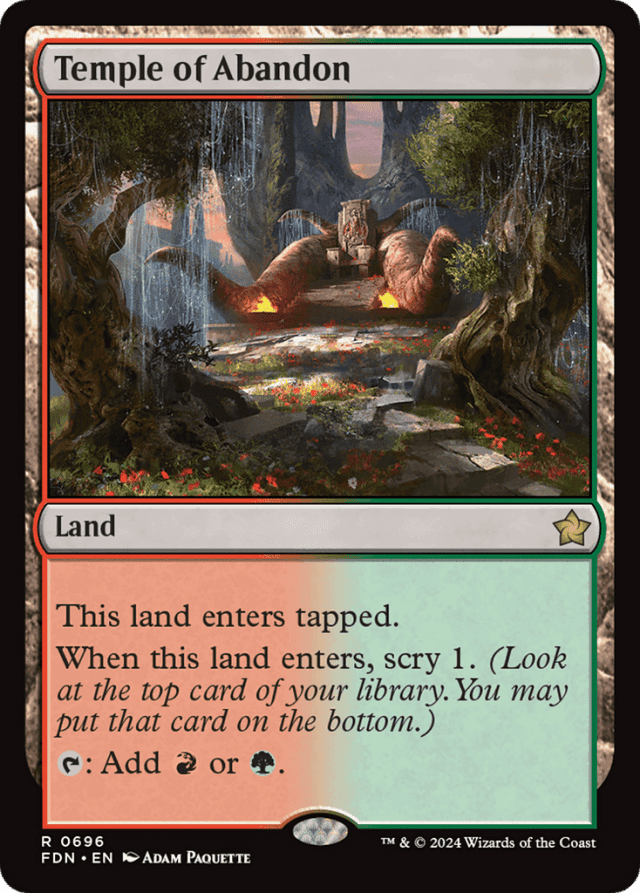 This land enters tapped. When this land enters, scry 1. (Look at the top card of your library. You may put that card on the bottom.) {T}: Add {R} or {G}.