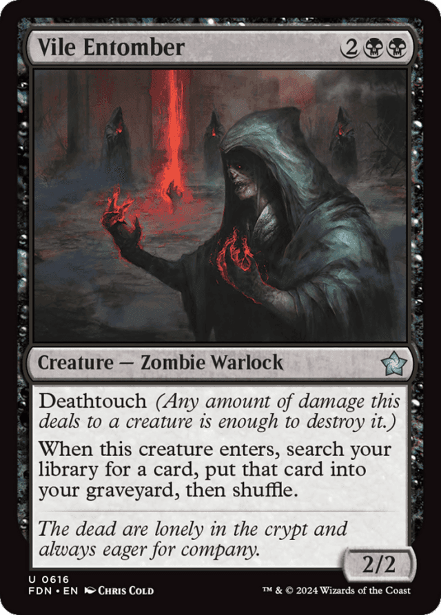 Deathtouch (Any amount of damage this deals to a creature is enough to destroy it.) When this creature enters, search your library for a card, put that card into your graveyard, then shuffle.