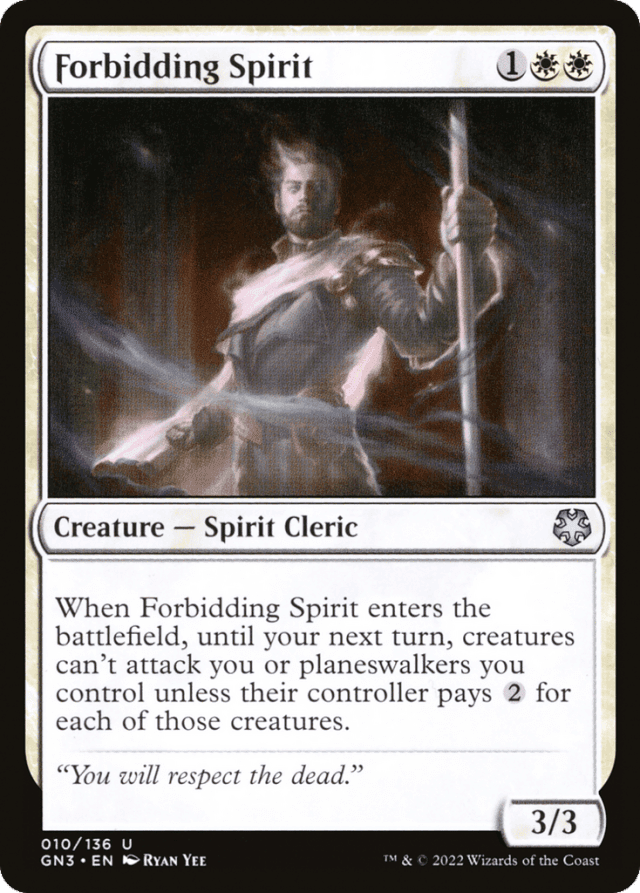 Because it doesn’t modify the characteristics of creatures, Forbidding Spirit’s triggered ability can affect creatures that enter the battlefield after that ability resolves. — Forbidding Spirit’s effect continues until your next turn even if Forbidding Spirit leaves the battlefield before then. — In a Two-Headed Giant game, creatures can attack your teammate and planeswalkers your teammate controls without requiring a mana payment. — While Forbidding Spirit’s effect is in effect, your opponents can choose not to pay to attack with a creature that attacks “if able.” If there’s no other player or planeswalker to attack, that creature simply doesn’t attack.