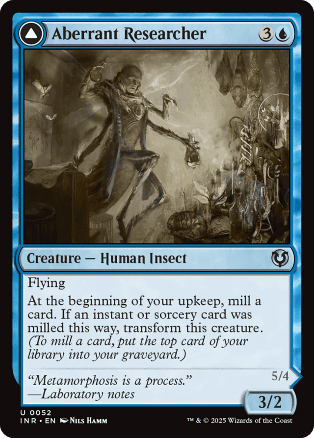 If a replacement effect causes the top card of your library to go to a zone other than your graveyard, Aberrant Researcher will still transform if that card was an instant or sorcery card. — No player may take any action between the two steps of Aberrant Researcher's triggered ability. If the card put into your graveyard is an instant or sorcery card, Aberrant Researcher will have transformed before a player can take any action.