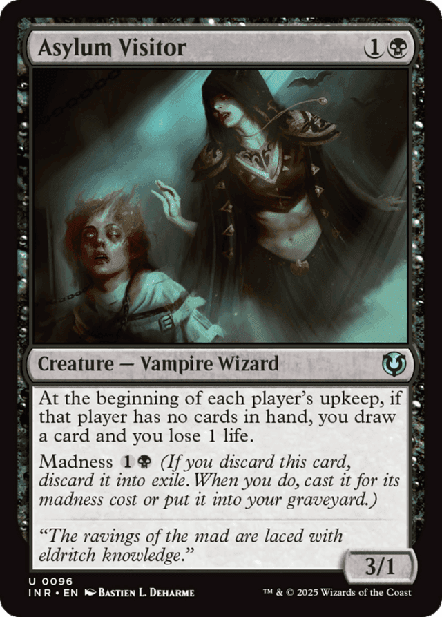 Asylum Visitor's triggered ability checks the active player's hand as the upkeep begins and as the trigger resolves. If that player has a card in hand as it resolves, you won't draw a card or lose 1 life. Notably, if you control multiple Asylum Visitors during your upkeep, whichever one's first ability resolves first will stop the other's first ability from having any effect unless you have a way to get the card you drew out of your hand before it resolves. — On an opponent's turn, triggered abilities you control will resolve before any triggered abilities of permanents that opponent controls if they trigger at the same time. This means that if you and your opponent each control an Asylum Visitor during your opponent's upkeep, and they have no cards in hand, you'll always draw a card before your opponent has a card in their hand. — The upkeep step is before the draw step, after the untap step. Asylum Visitor's first ability will trigger and resolve before the active player draws a card in their draw step if that player has no cards in hand. — A card with madness that's discarded counts as having been discarded even though it's put into exile rather than a graveyard. If it was discarded to pay a cost, that cost is still paid. Abilities that trigger when a card is discarded will still trigger. — A spell cast for its madness cost is put onto the stack like any other spell. It can be countered, copied, and so on. As it resolves, it's put onto the battlefield if it's a permanent card or into its owner's graveyard if it's an instant or sorcery card. — Cards are discarded in a Magic game only from a player's hand. Effects that put cards into a player's graveyard from anywhere else do not cause those cards to be discarded. — Casting a spell with madness ignores the timing rules based on the card's card type. For example, you can cast a sorcery with madness if you discard it during an opponent's turn. — If you choose not to cast a card with madness when the madness triggered ability resolves, it's put into your graveyard. Madness doesn't give you another chance to cast it later. — If you discard a card with madness to pay the cost of a spell or activated ability, that card's madness triggered ability (and the spell that card becomes, if you choose to cast it) will resolve before the spell or ability the discard paid for. — If you discard a card with madness while a spell or ability is resolving, it moves immediately to exile. Continue resolving that spell or ability, noting that the card you discarded is not in your graveyard at this time. Its madness triggered ability will be placed onto the stack once that spell or ability has completely resolved. — Madness works independently of why you're discarding the card. You could discard it to pay a cost, because a spell or ability tells you to, or because you have too many cards in your hand during your cleanup step. You can't discard a card with madness just because you want to, though. — To determine the total cost of a spell, start with the mana cost or alternative cost (such as a madness cost) you're paying, add any cost increases, then apply any cost reductions. The mana value of the spell is determined by only its mana cost, no matter what the total cost to cast that spell was.