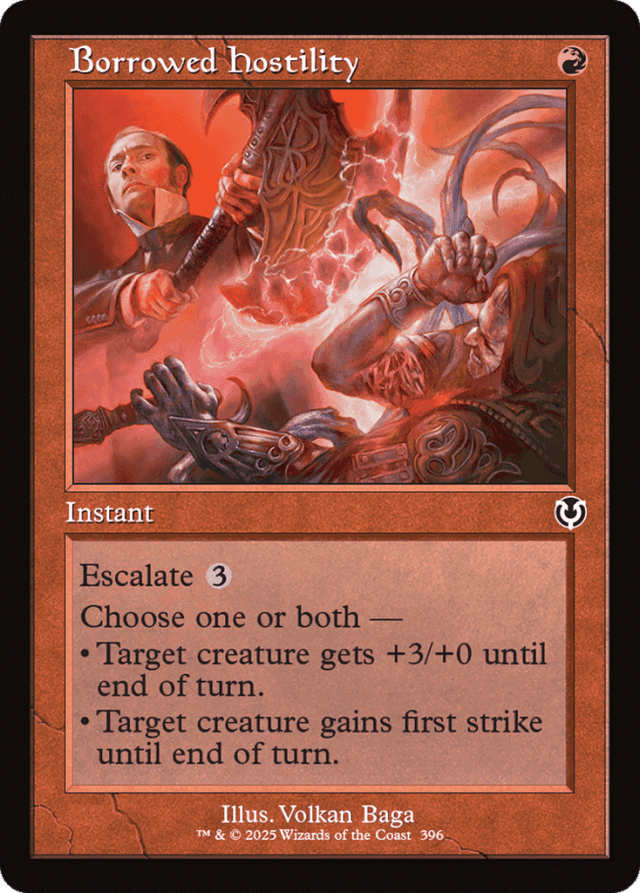 Escalate {3} (Pay this cost for each mode chosen beyond the first.) Choose one or both — • Target creature gets +3/+0 until end of turn. • Target creature gains first strike until end of turn.