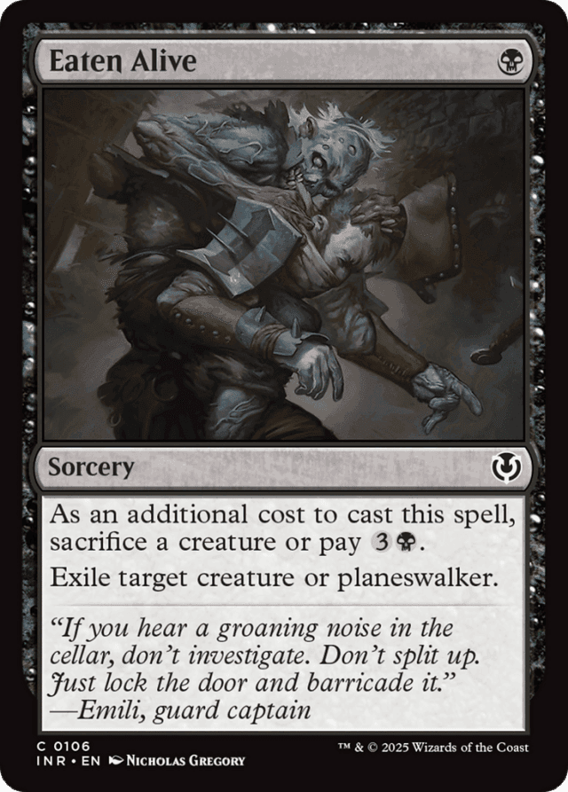 As an additional cost to cast this spell, sacrifice a creature or pay {3}{B}. Exile target creature or planeswalker.