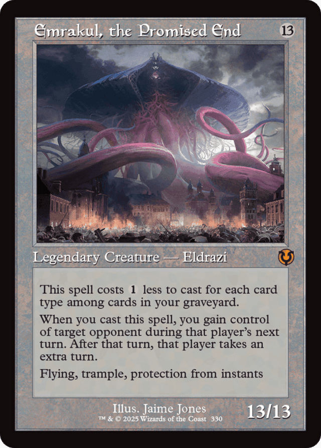 An ability that triggers when a player casts a spell resolves before the spell that caused it to trigger. It resolves even if that spell is countered or otherwise leaves the stack without resolving. — Controlling a player doesn’t allow you to look at that player’s sideboard. If an effect instructs that player to choose a card from outside the game, you can’t have that player choose any card. — If the targeted player loses the game while you control their turn during a multiplayer game, the extra turn never begins. — If the targeted player skips their next turn, you’ll control the next turn the affected player actually takes, and the extra turn the player takes will be after that turn. — In a Two-Headed Giant game, gaining control of a player causes you to gain control of each player on that team. — Multiple player-controlling effects that affect the same player overwrite each other. The last one to be created is the one that works. If multiple players have cast Emrakul and targeted the same player, each ability’s effect will create an extra turn. — Protection abilities only apply while the object with the ability is on the battlefield. Notably, Emrakul may be the target of a spell that targets it while on the stack, such as Syncopate. — Protection from instants means that Emrakul can’t be the target of instant spells or activated or triggered abilities from instant cards, and damage that would be dealt to it by instant spells or cards is prevented. Instant spells may still affect it in other ways; for example, it would still receive the bonus from Rally the Peasants. — The card types that could appear in your graveyard are artifact, battle, creature, enchantment, instant, kindred, land, planeswalker, and sorcery. Supertypes (such as legendary and basic) and subtypes (such as Human and Equipment) are not counted. The maximum discount that Emrakul’s own ability can provide is {9}. — The player you’re controlling is still the active player during that turn. — While controlling another player, you also continue to make your own choices and decisions. — While controlling another player, you can see all cards in the game that player can see. This includes cards in that player’s hand, face-down cards that player controls, and any cards in that player’s library the player may look at. — While controlling another player, you make all choices and decisions that player is allowed to make or is told to make during that turn. This includes choices about what spells to cast or what abilities to activate, as well as any decisions called for by triggered abilities or for any other reason. — You also can’t make any choices or decisions for the player that would be called for by the tournament rules (such as whether to take an intentional draw or whether to call a judge). — You can use only the affected player’s resources (cards, mana, and so on) to pay costs for that player; you can’t use your own. Similarly, you can use the affected player’s resources only to pay that player’s costs; you can’t spend them on your costs. — You can’t make any illegal decisions or illegal choices—you can’t do anything that player couldn’t do. You can’t make choices or decisions for that player that aren’t called for by the game rules or by any cards, permanents, spells, abilities, and so on. If an effect causes another player to make decisions that the affected player would normally make (such as Master Warcraft does), that effect takes precedence. In other words, if the affected player wouldn’t make a decision, you wouldn’t make that decision on that player’s behalf. — You can’t make the affected player concede. That player may choose to concede at any time, even while you’re controlling that player. — You only control the player. You don’t control any of that player’s permanents, spells, or abilities.
