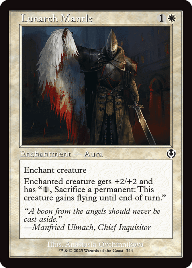 Only the player who controls the enchanted creature can activate the ability it gains from Lunarch Mantle. This might not be the controller of Lunarch Mantle. — You can activate the ability Lunarch Mantle grants to your enchanted creature by sacrificing any permanent you control, including Lunarch Mantle or the enchanted creature itself. If you sacrifice Lunarch Mantle this way, the creature it previously enchanted still gains flying.