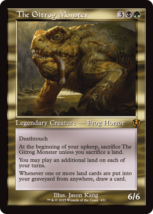 Deathtouch At the beginning of your upkeep, sacrifice The Gitrog Monster unless you sacrifice a land. You may play an additional land on each of your turns. Whenever one or more land cards are put into your graveyard from anywhere, draw a card.