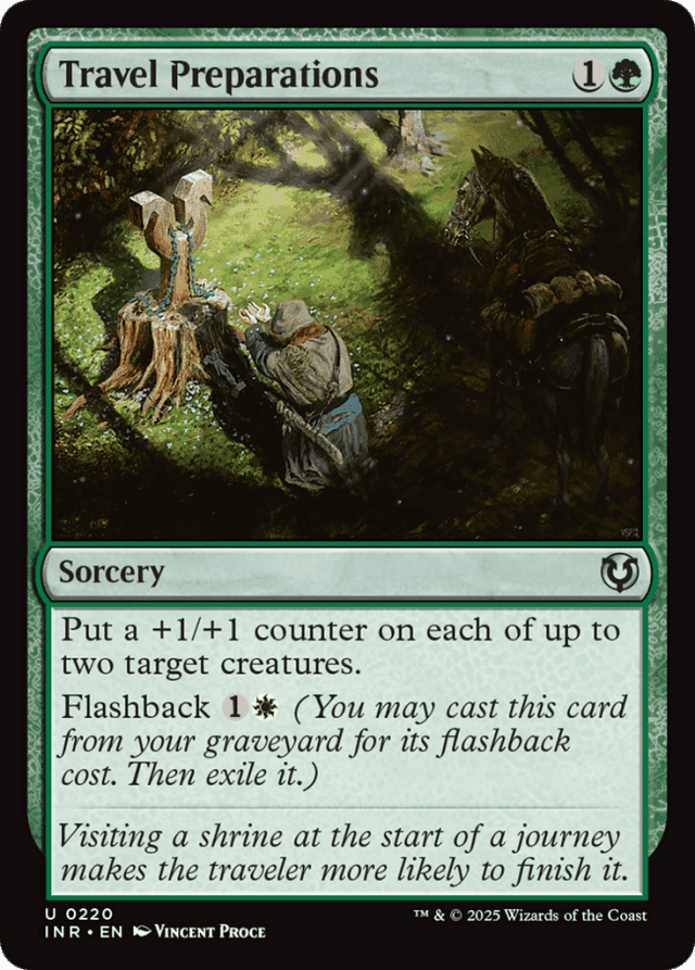 If Travel Preparations targets two creatures, and one of them is an illegal target by the time Travel Preparations resolves, you'll still put a +1/+1 counter on the other creature. — You can't target the same creature twice to put two +1/+1 counters on it. — "Flashback [cost]" means "You may cast this card from your graveyard by paying [cost] rather than paying its mana cost" and "If the flashback cost was paid, exile this card instead of putting it anywhere else any time it would leave the stack." — A spell cast using flashback will always be exiled afterward, whether it resolves, is countered, or leaves the stack in some other way. — If a card with flashback is put into your graveyard during your turn, you can cast it if it's legal to do so before any other player can take any actions. — To determine the total cost of a spell, start with the mana cost or alternative cost (such as a flashback cost) you're paying, add any cost increases, then apply any cost reductions. The mana value of the spell is determined only by its mana cost, no matter what the total cost to cast the spell was. — You can cast a spell using flashback even if it was somehow put into your graveyard without having been cast. — You must still follow any timing restrictions and permissions, including those based on the card's type. For instance, you can cast a sorcery using flashback only when you could normally cast a sorcery.