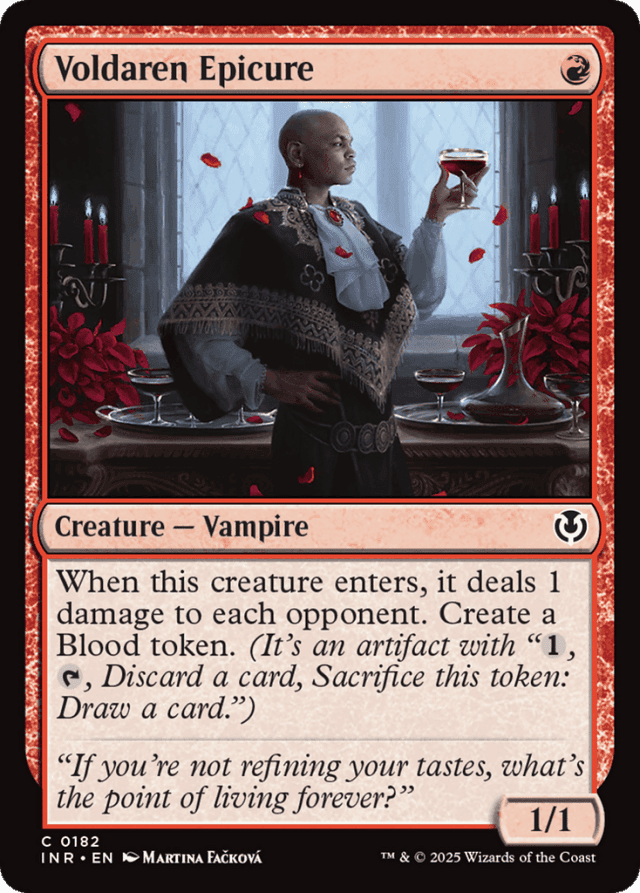 When this creature enters, it deals 1 damage to each opponent. Create a Blood token. (It's an artifact with "{1}, {T}, Discard a card, Sacrifice this token: Draw a card.")