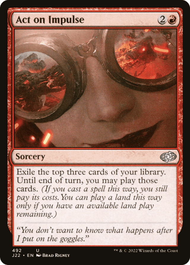Any cards you don't play will remain exiled. — Playing a card this way follows the normal rules for playing the card. You must pay its costs, and you must follow all applicable timing rules. For example, if one of the cards is a creature card, you can cast that card only during your main phase while the stack is empty. — The cards are exiled face up. — Under normal circumstances, you can play a land card exiled with Act on Impulse only if you haven't played a land yet that turn.