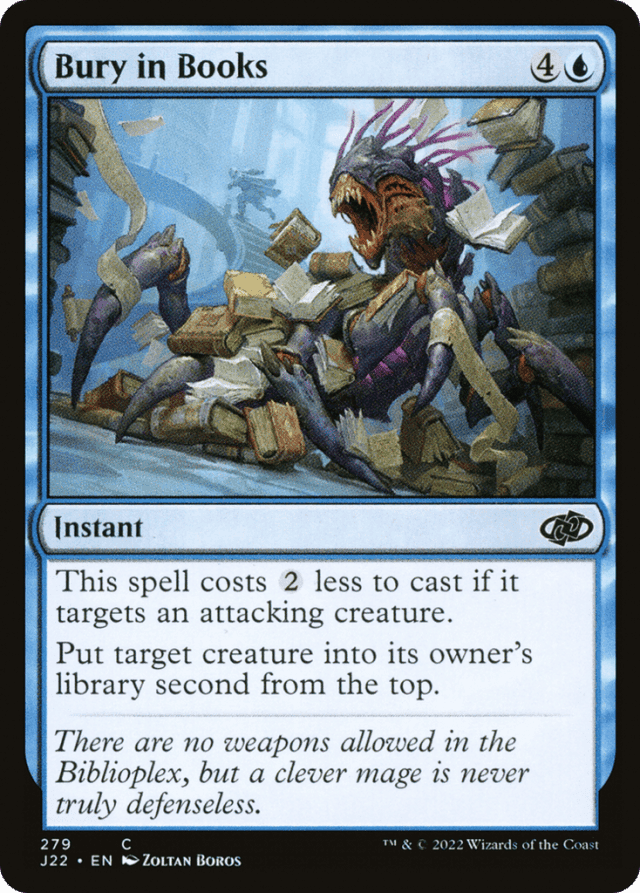 If the target creature's controller has zero cards left in their library when Bury in Books resolves, that creature becomes the top card of their library.