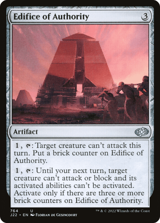 Activated abilities contain a colon. They’re generally written “[Cost]: [Effect].” Some keyword abilities are activated abilities and will have colons in their reminder text. Triggered abilities (starting with “when,” “whenever,” or “at”) are unaffected by the last ability of Edifice of Authority. Notably, exerting a creature isn’t an activated ability. — Edifice of Authority can’t be used to undo an attack or block once it has been declared. Its abilities must be activated no later than the beginning of combat step to stop a creature from attacking, and no later than the declare attackers step to stop a creature from blocking. — Once a player has announced that they are activating the ability of a creature, Edifice of Authority can’t be used to undo it. Its last ability must be activated before the player activates that creature’s ability. The player may respond to Edifice of Authority’s ability with the target creature’s ability if able.
