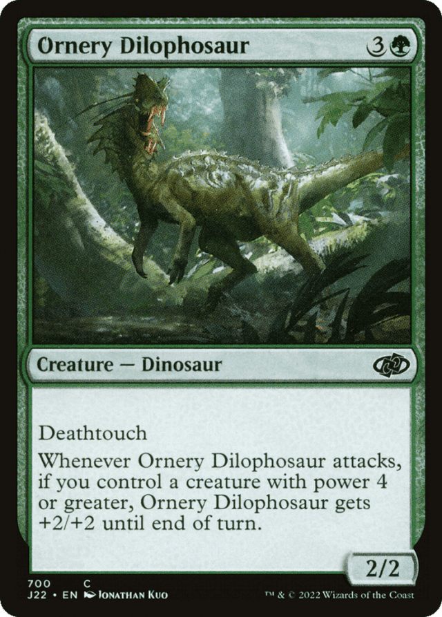 If Ornery Dilophosaur's power is raised to 4 or greater, its ability triggers when it attacks. — If you don't control a creature with power 4 or greater immediately after Ornery Dilophosaur attacks, its ability doesn't trigger. If you don't control one as the ability resolves, it has no effect. It doesn't have to be the same creature at both times, however. — Once Ornery Dilophosaur's ability has resolved, it keeps +2/+2 for the rest of the turn even if you no longer control a creature with power 4 or greater. — Ornery Dilophosaur gets just +2/+2, no matter how many creatures you control with power 4 or greater.