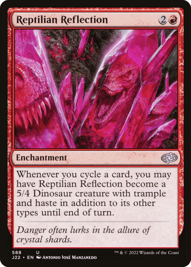Whenever you cycle a card, you may have this enchantment become a 5/4 Dinosaur creature with trample and haste in addition to its other types until end of turn.