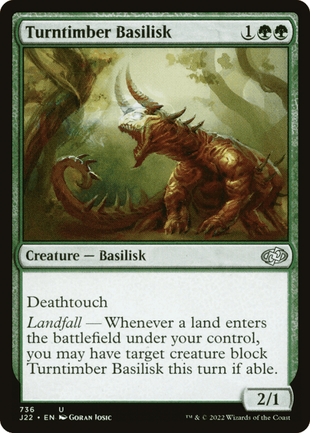 Deciding to have the targeted creature block doesn't force you to attack with Turntimber Basilisk that turn. If Turntimber Basilisk doesn't attack, the targeted creature is free to block whichever creature its controller chooses, or block no creatures at all. — If Turntimber Basilisk's landfall ability triggers multiple times during the same turn, you can have multiple creatures block it that turn if able. — If you choose to have the targeted creature block but that creature isn't able to block Turntimber Basilisk (for example, because the targeted creature can block only creatures with flying), the requirement to block does nothing. The targeted creature is free to block whichever creature its controller chooses, or block no creatures at all. — Tapped creatures, creatures that can't block as the result of an effect, creatures with unpaid costs to block (such as those from War Cadence), and creatures that aren't controlled by the defending player are exempt from effects that would require them to block. Such creatures can be targeted by Turntimber Basilisk's landfall ability, but the requirement to block does nothing. — You decide whether to have the targeted creature block Turntimber Basilisk this turn if able at the time the landfall ability resolves, not at the time Turntimber Basilisk attacks. — A landfall ability doesn't trigger if a permanent already on the battlefield becomes a land. — A landfall ability triggers whenever a land you control enters for any reason. It triggers whenever you play a land, as well as whenever a spell or ability puts a land onto the battlefield under your control. — Whenever a land you control enters, each landfall ability of the permanents you control will trigger. You can put them on the stack in any order. The last ability you put on the stack will be the first one to resolve (As a result, you can have those abilities resolve in the order of your choosing.).
