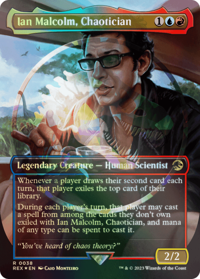 Whenever a player draws their second card each turn, that player exiles the top card of their library. During each player's turn, that player may cast a spell from among the cards they don't own exiled with Ian Malcolm, and mana of any type can be spent to cast it.