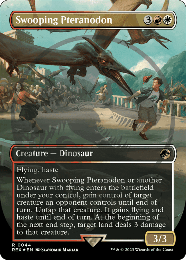 Flying, haste Whenever this creature or another Dinosaur you control with flying enters, gain control of target creature an opponent controls until end of turn. Untap that creature. It gains flying and haste until end of turn. At the beginning of the next end step, target land deals 3 damage to that creature.