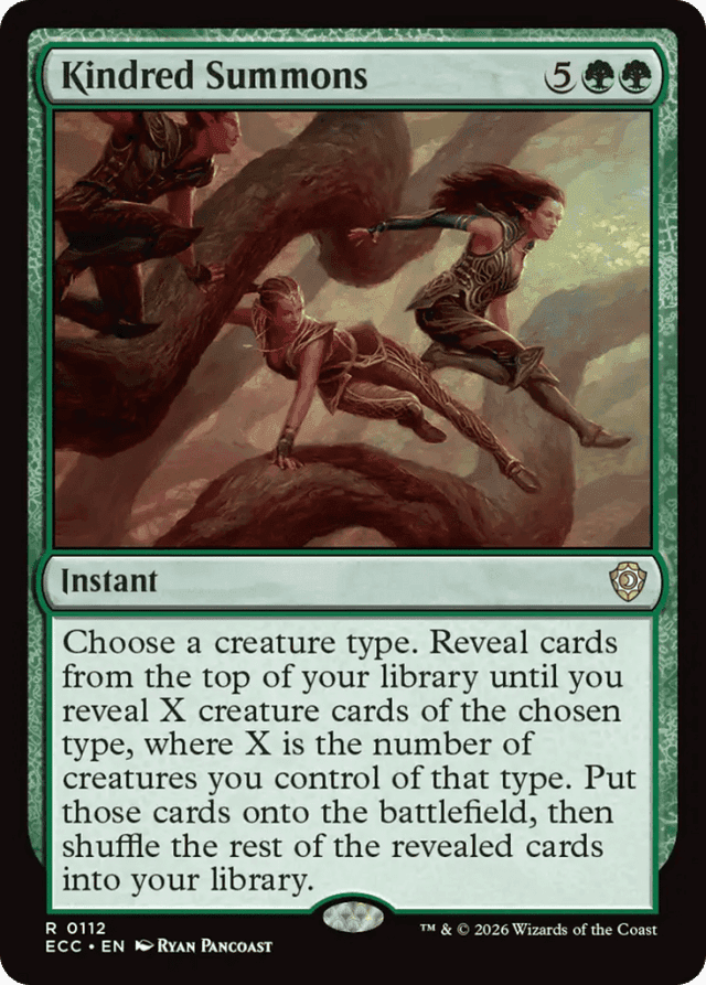 Choose a creature type. Reveal cards from the top of your library until you reveal X creature cards of the chosen type, where X is the number of creatures you control of that type. Put those cards onto the battlefield, then shuffle the rest of the revealed cards into your library.