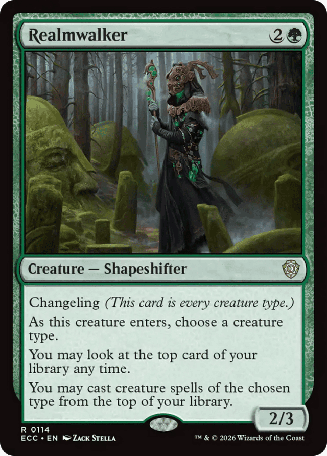 Changeling is a characteristic-defining ability. It functions in all zones, not only while a card that has it is on the battlefield. — If Realmwalker is somehow on the battlefield with no choice having been made for it, you may still look at the top card of your library any time. You won't be able to cast any creature spells from the top of your library, even if they have no creature types. — If an effect causes a creature with changeling to become a new creature type, it will be only that new creature type. It will still have changeling; the effect making it all creature types will simply be overwritten. — If an effect causes a creature with changeling to lose all abilities, it will remain all creature types, even though it will no longer have changeling. This is because changeling applies before the effect that removes it. — If the top card of your library changes while you're casting a spell, playing a land, or activating an ability, you can't look at the new top card until you finish doing so. This means that if you cast a spell from the top of your library, you can't look at the next one until you're done paying for that spell. — Realmwalker doesn't change when you can cast creature spells. Normally, this means during your main phase when the stack is empty, although flash may change this. — The subtype Shapeshifter that appears on the type line is mostly there to reinforce the flavor. A creature card with changeling is just as much an Elf, a Dwarf, a Sliver, a Goat, a Coward, and a Zombie as it is a Shapeshifter. — The top card of your library isn't in your hand, so you can't foretell it, discard it, or activate any of its activated abilities. — You can look at the top card of your library whenever you want (with one restriction; see below), even if you don't have priority. This action doesn't use the stack. Knowing what that card is becomes part of the information you have access to, just like you can look at the cards in your hand. — You must choose an existing creature type, such as Elk or Advisor. You can't choose card types (e.g., artifact) or supertypes (e.g., snow). — You'll still pay all costs for the spell, including additional costs. You may also pay alternative costs if any are available.