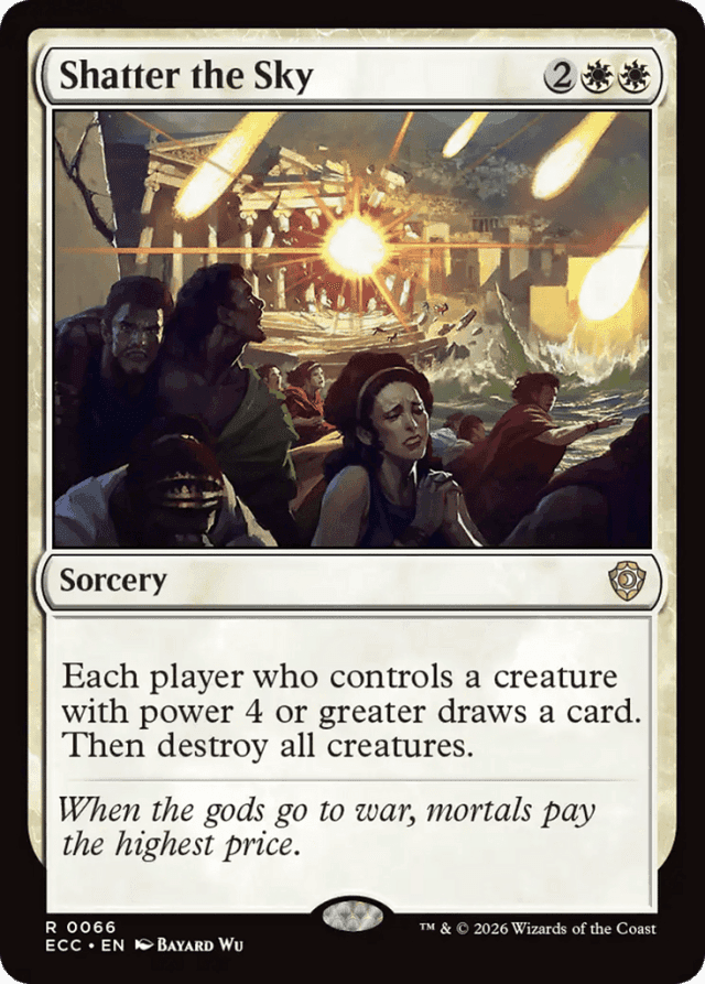 No player may take any actions between the time each qualifying player draws a card and the time all creatures are destroyed. — Shatter the Sky destroys all creatures, even if no player draws a card.