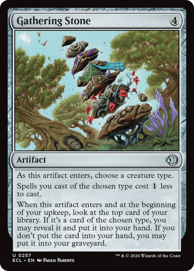 As this artifact enters, choose a creature type. Spells you cast of the chosen type cost {1} less to cast. When this artifact enters and at the beginning of your upkeep, look at the top card of your library. If it's a card of the chosen type, you may reveal it and put it into your hand. If you don't put the card into your hand, you may put it into your graveyard.