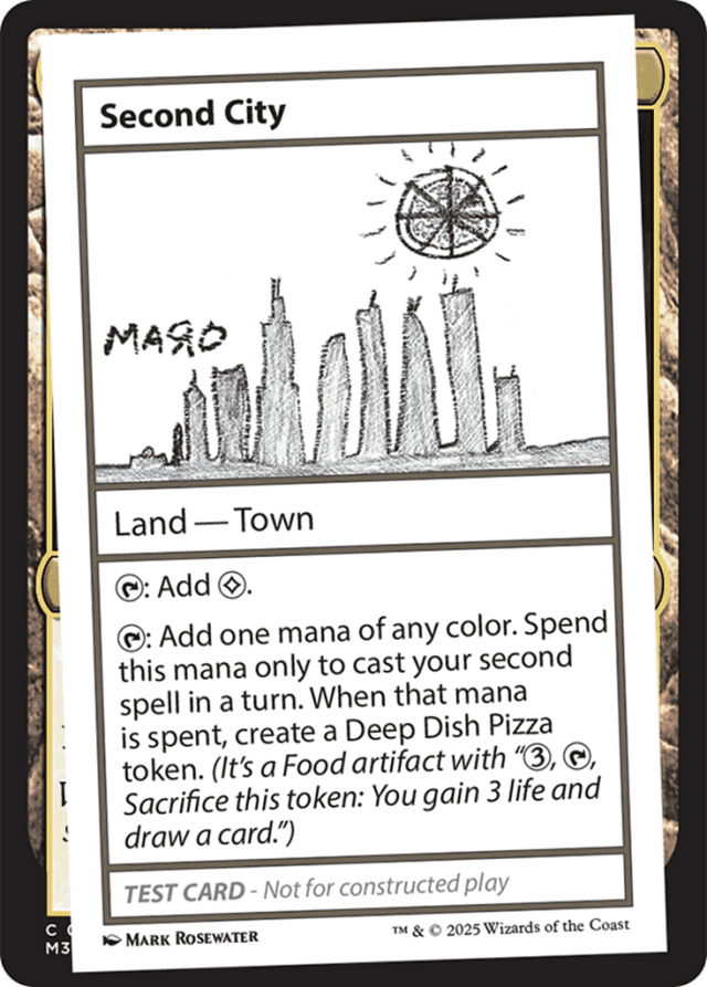 {T}: Add {C}. {T}: Add one mana of any color. Spend this mana only to cast your second spell in a turn. When that mana is spent, create a Deep Dish Pizza token. (It's a Food artifact with "{3}, {T}, Sacrifice this token: You gain 3 life and draw a card.")